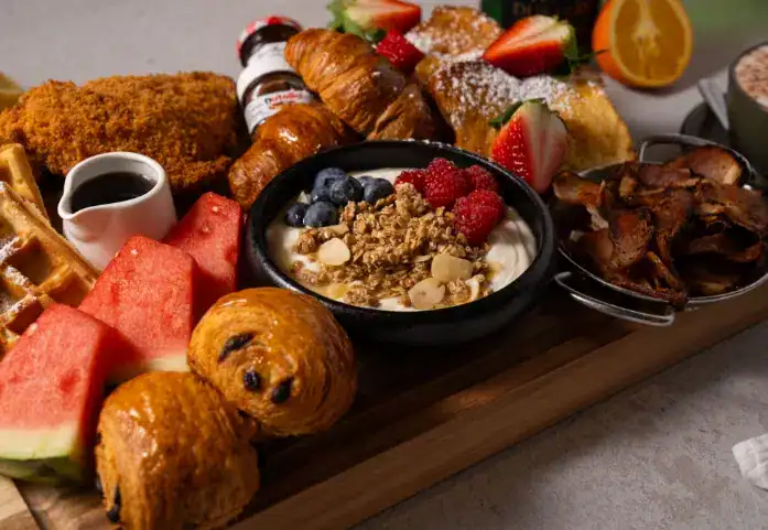 Feast your taste buds on our Easter Brunch menu featuring rich, savory flavors and sweet indulgences. Start with bites like Golden Aligot Bites topped with fried shallots and marinara, or our signature Beignets di Parma filled with burrata, prosciutto, and honey chili oil. Enjoy homemade hummus with warm naan, alongside a basket of waffles, pancakes, French toast, and buttery croissants. Choose your starter from options like a Veggie French Omelette, a bacon, egg & cheese croissant, or Chicken & Waffles made with an all-natural chicken breast and crispy Belgian waffles. For the main course, pick from fresh Avocado Toasts, the juicy Butterfly Burger, flavorful Seared Sesame Ahi Tuna, or Prime Skirt Steak with egg and hashbrowns. Finish with assorted desserts from Rosallie Bakery, and sip on black coffee, juice, or treat yourself to our All-You-Can-Drink Mimosa Bar or Helena Girl Selection featuring sangria, spritzes, and frozen cocktails.