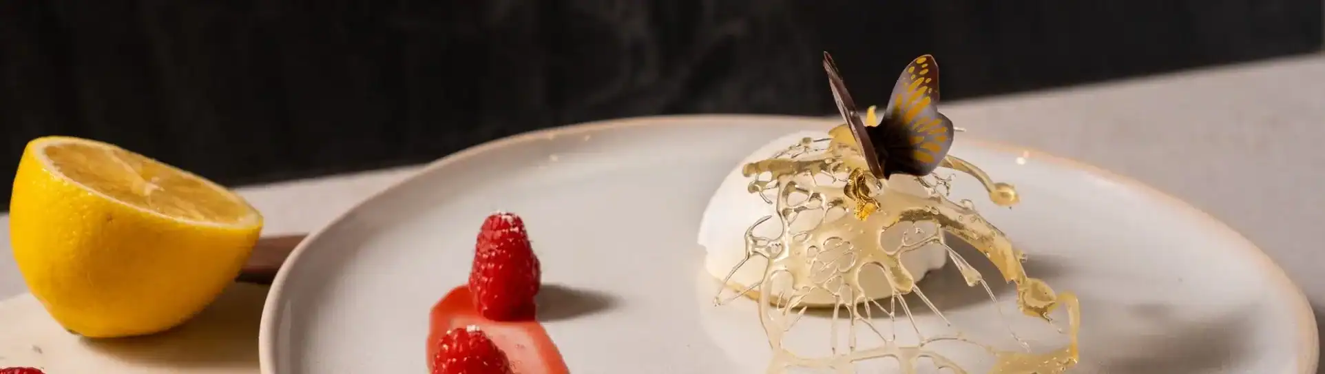 Vanilla genoise, lemon mousse, and raspberry, finished with lemon glaze and white chocolate curls